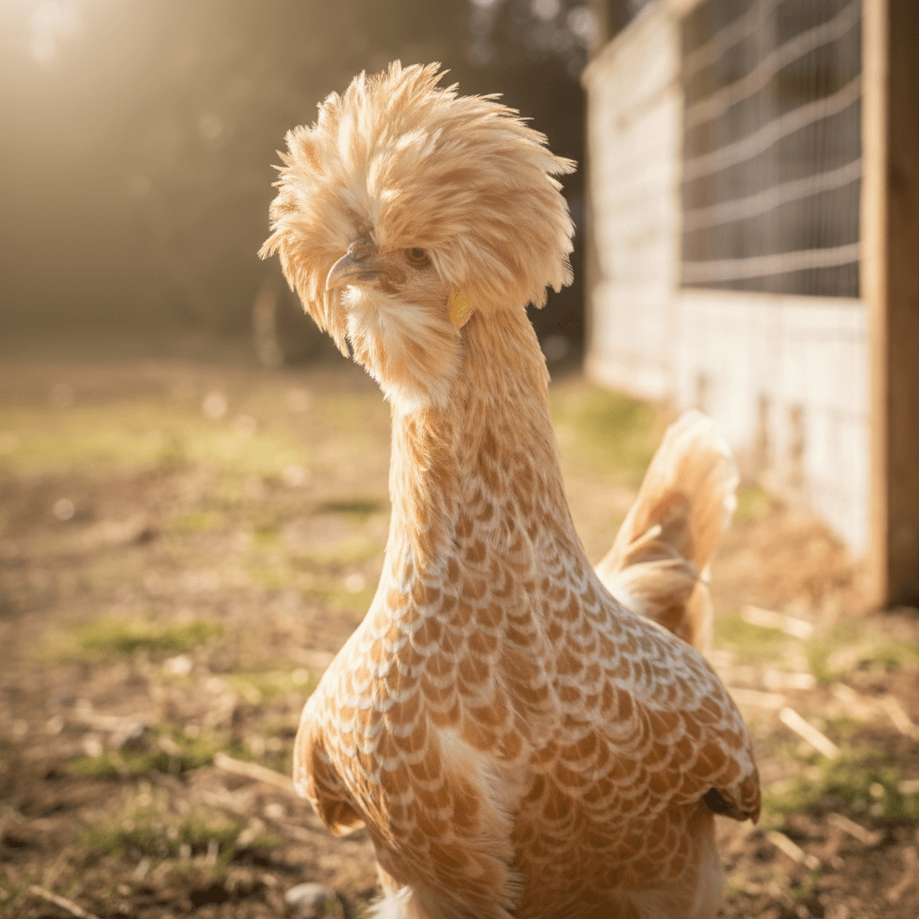 Buff Laced Polish are a beautiful variety of Polish Chickens. Birds are buff colored with white lacing around the edges of their feathers. Polish are best known for their top hat or crazy feathers on top of their heads!